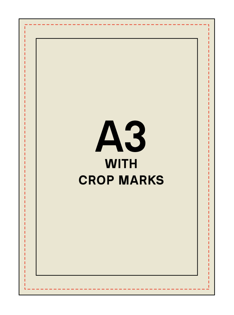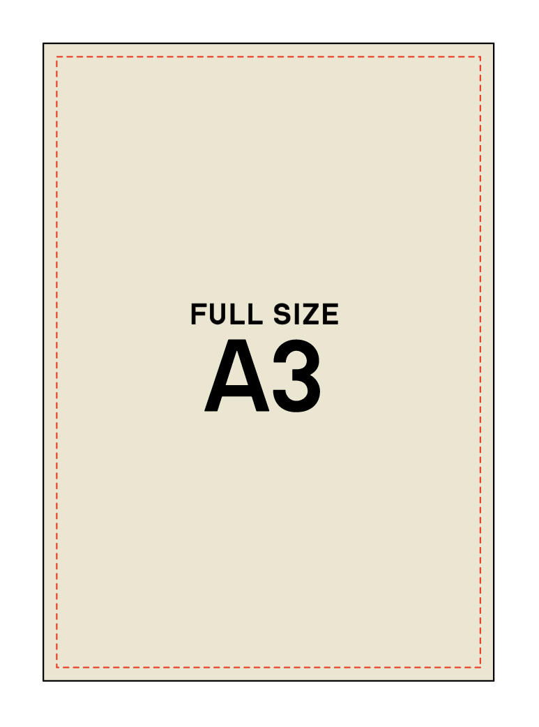 If your artwork is smaller than A3, please place than as much as you can on A3 artboard with 3mm bleed and provide crop marks on your artwork.